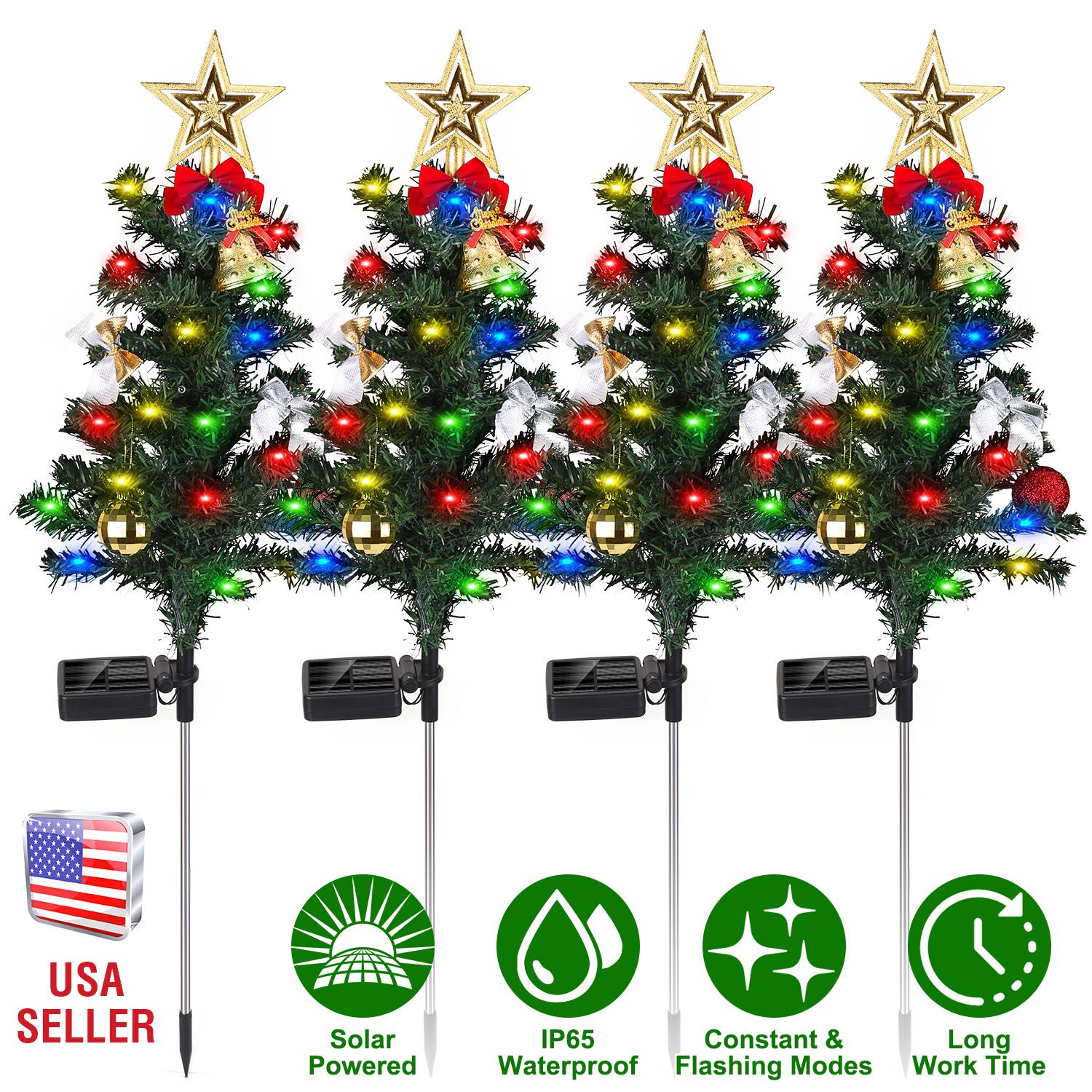 Christmas is coming! Do you have good ideas to decorate your home? Our Christmas tree light set includes 4 trees and various decors like stars, decorative Bells, Christmas balls and bowties is an ideal choice for you! Just insert the tree in your front door and you can decorate the tree with your family during the happy time. Colorful lighting effect with constant and flashing mode is able to create warm and joyful atmosphere. IP65 Waterproof performance allows it to withstand heavy weather like rain and snow, perfect for outdoor decor!