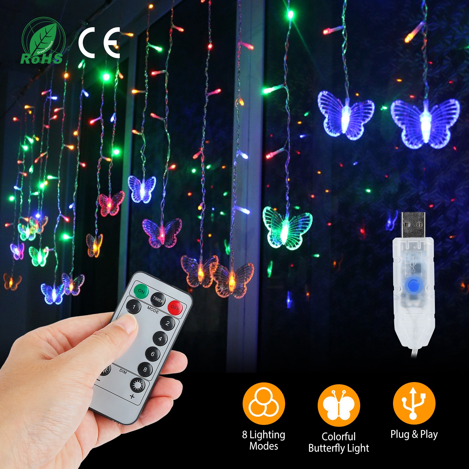 Comes with 16 delicate transparent and crystal butterflies and 80 cute small led lamp beads, our Butterfly Fairy Colorful Light can create a great and romantic atmosphere with colorful light. Featured with 8 modes, timer setting and brightness adjustable function, and come with a remote controller, just plug in USB interface and press the button select different modes and brightness to dress your room into a fairyland and take you into a dream world! Perfect for decorating Bedroom, Wedding, Party in Christmas, Valentine\'s Day and daily life!