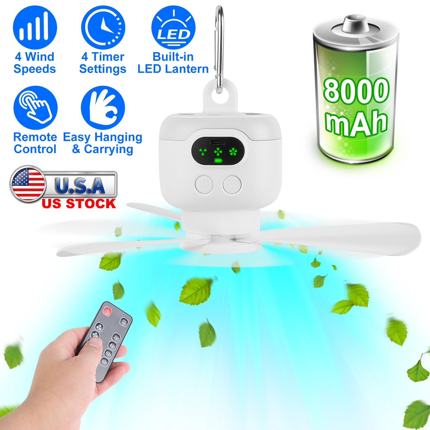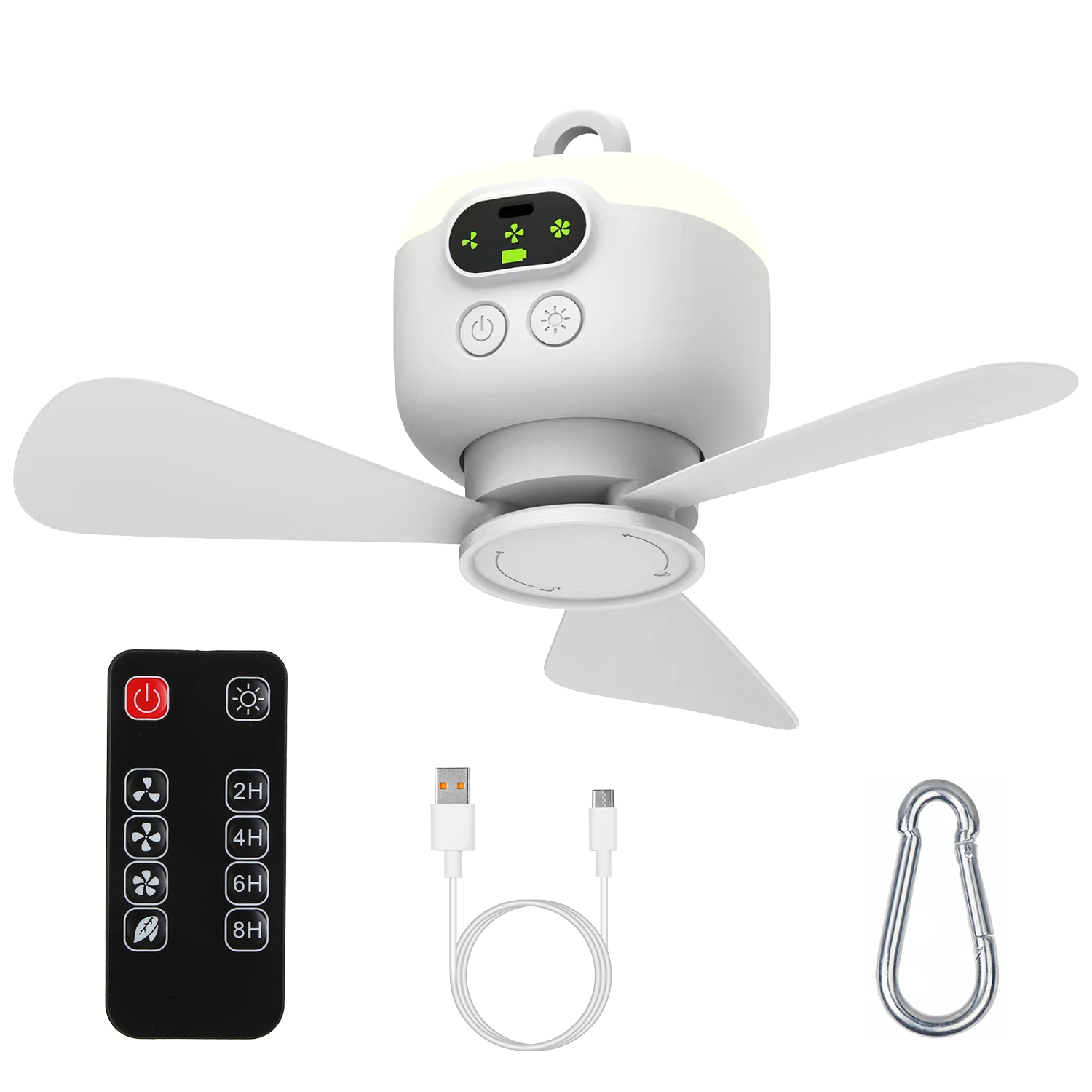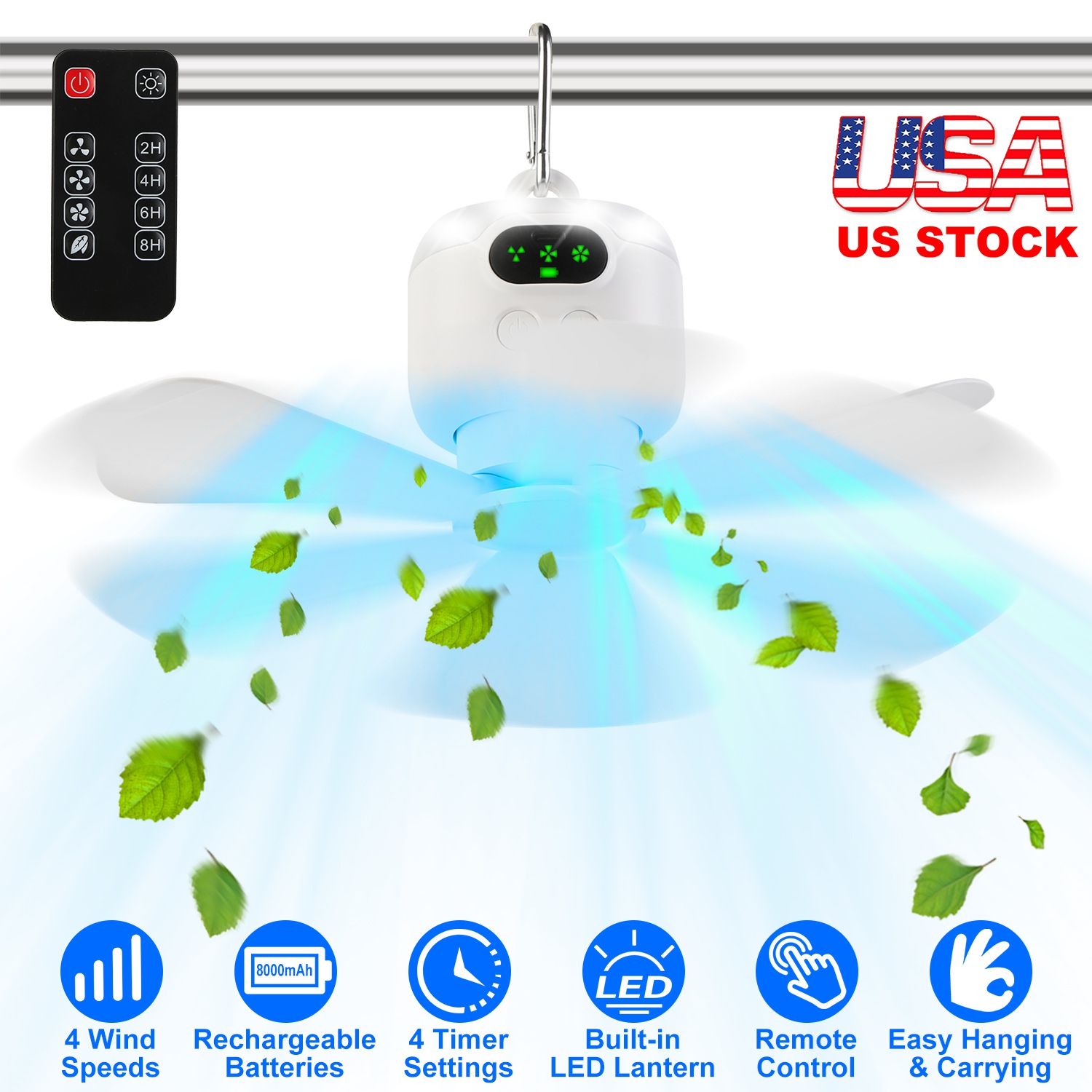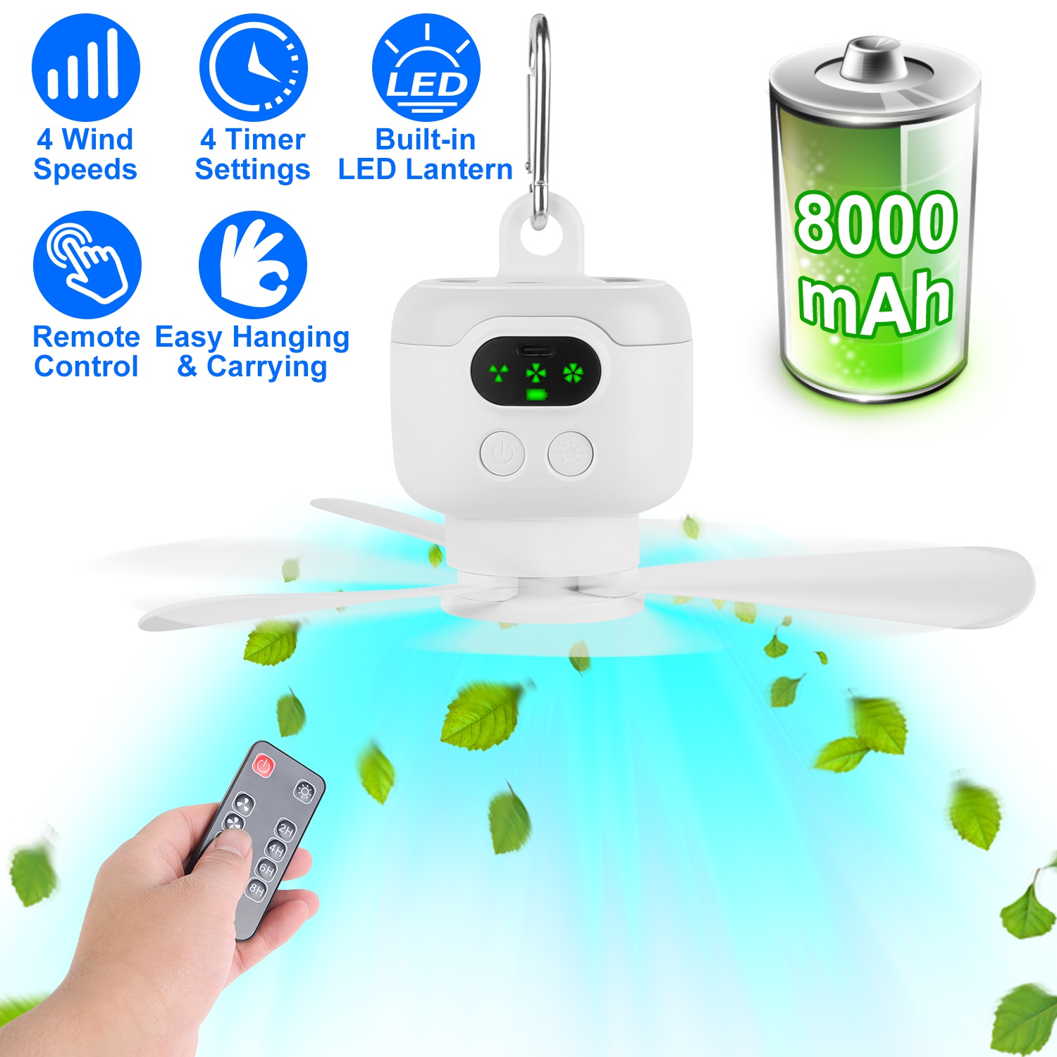 Enhance your outdoor experience with this versatile 2-in-1 camping fan and LED lantern. Perfect for camping trips, beach outings, or any outdoor adventure, this rechargeable camping fan provides both cooling airflow and bright illumination. With 4 wind speeds, 4 timer settings, low noise operation, and a digital display, it\'s designed for comfort and convenience. The detachable fan blades make it easy to store and carry, while the remote control adds to the user-friendly experience. Whether you\'re setting up camp or relaxing in your tent, this camping fan is your essential companion.