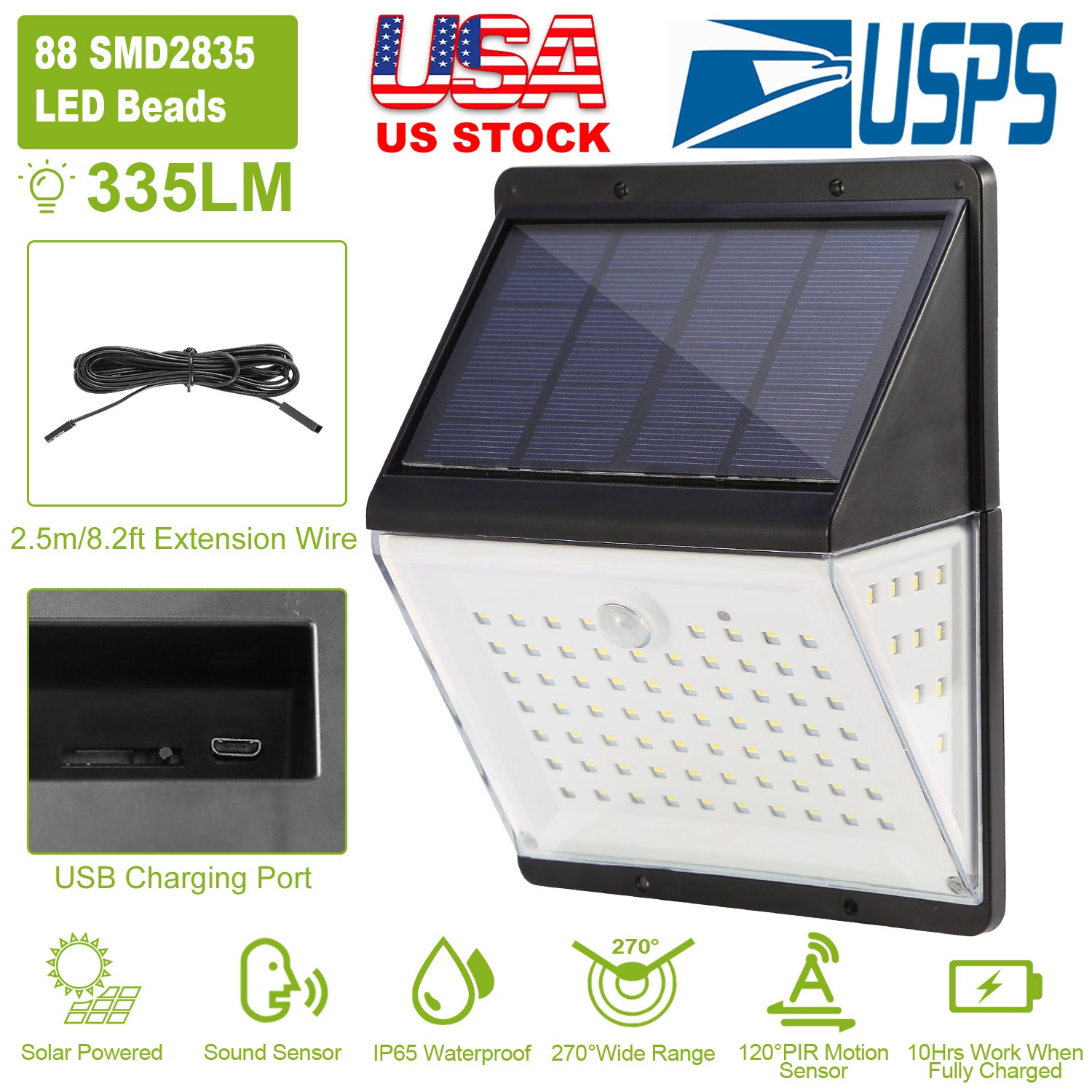Home > Solar Lights 88 LEDs Wall Lamps Outdoor 120° Motion Sensor Sound Control Lightings 270°Illumination IP65 Waterproof w/ 2.5m Extend Wire for Garage Gar