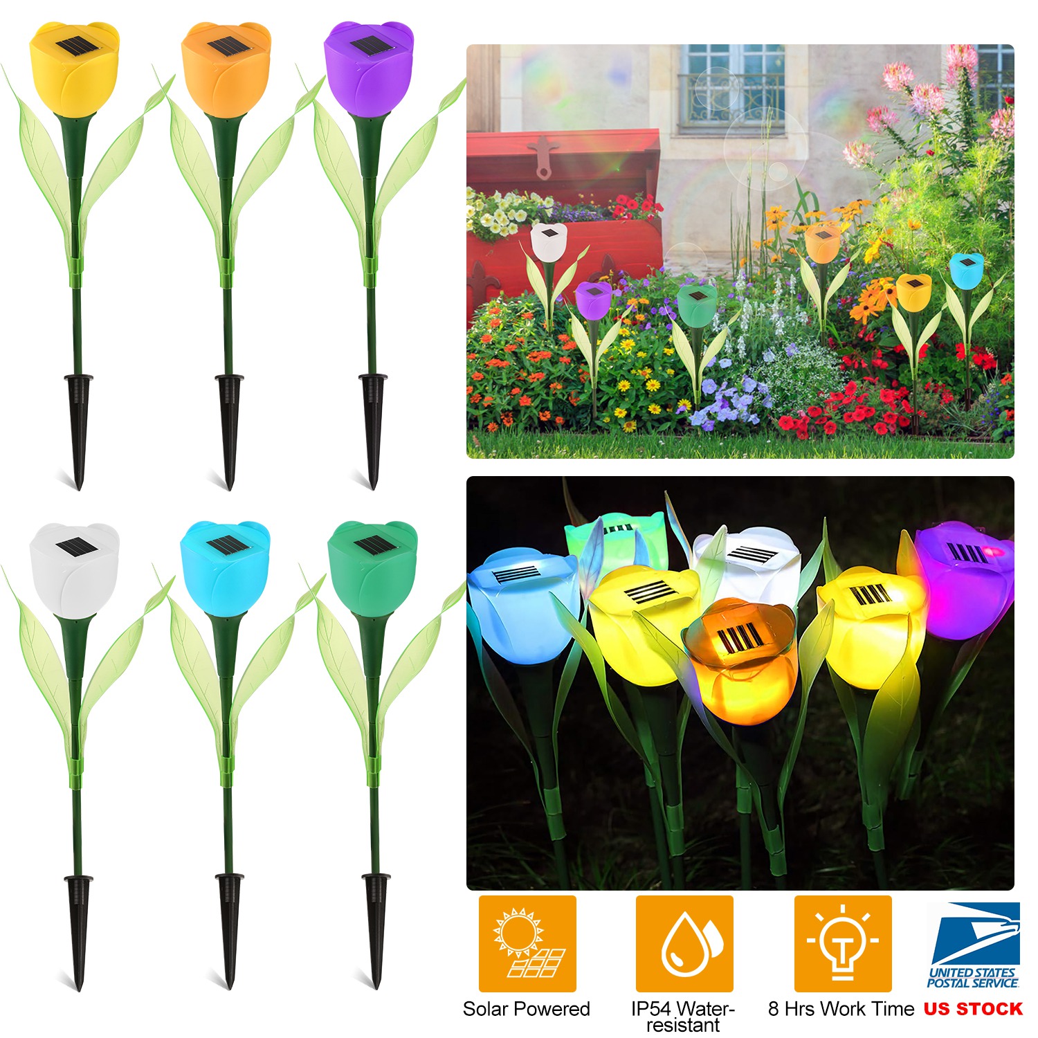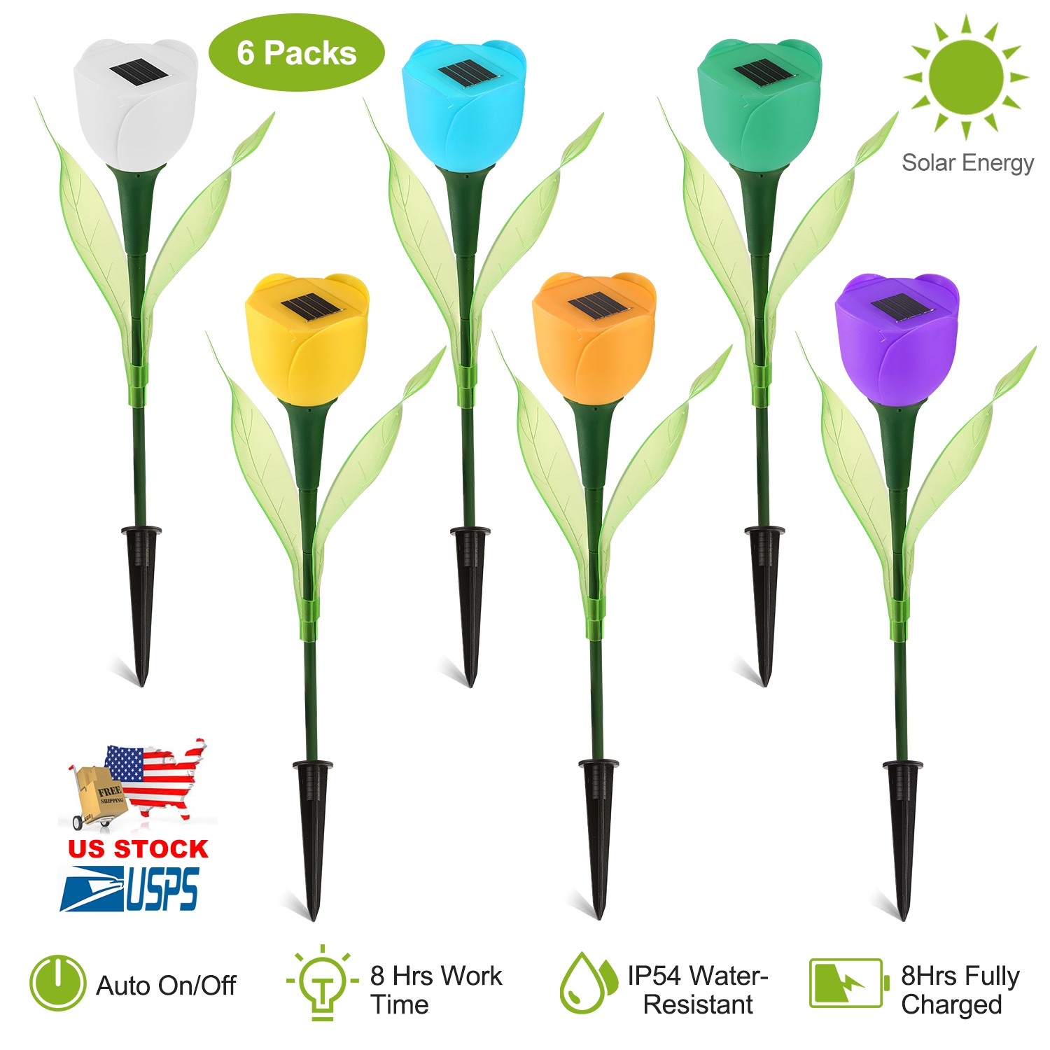 Our solar garden tulip flower lights contain 6 different colored lights including Yellow, White, Purple, Green, Blue, Orange. Each light has a built-in 13000MCD LED that glows brightly. The lights only require first time turn-on, then will automatically turn on at night and off in the day time. With IP55 protection rating, it’s designed for all weather outdoors. Each light resembles a beautiful tulip flower. With six or more of them planted in your yard, garden, or flowerbed, you’re going to experience dazzling night view. Want put it in a vase like a real flower? It’s definitely a good idea. It looks great in a vase too. You won’t even notice that it’s artificial flower unless you get close. It’s also good for night lighting at the side of fence. Or lining your walkways, putting them on each side of the steps, all are good options as they look extremely beautiful wherever put.