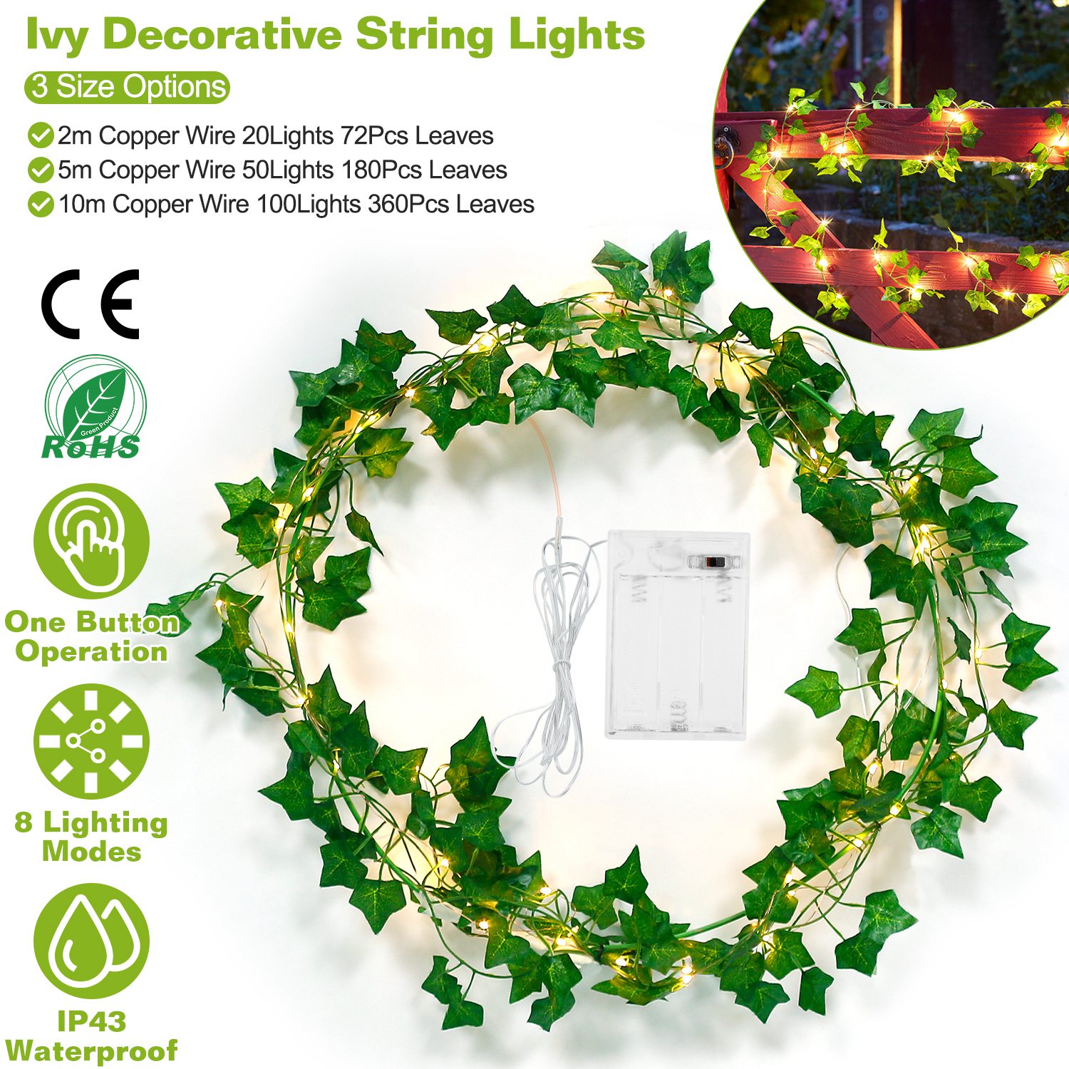 Exquisite color dyeing technology makes leaves distinctly green with clear texture. Multiple LED beads are dotted on the copper string lights, can be bent to any shape you desire. 8 Lighting modes and IP43 waterproof, meet your various needs and the battery box is waterproof, resist harsh weather. It can be widely used for indoor and outdoor decoration, wedding decoration, wall decoration, corridor decoration, bedroom bedside decoration, and even farmhouse decoration.