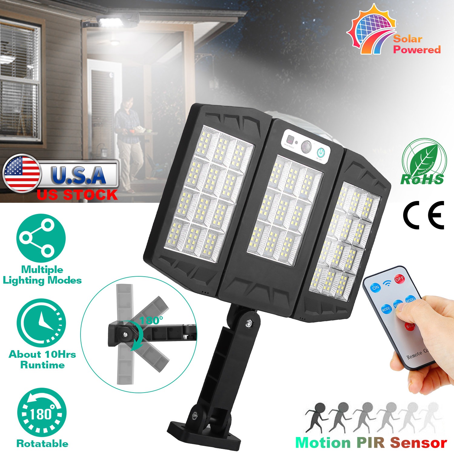 Our Solar Light offers you an optimal solution for illuminating at dark night; which features upgraded PIR motion sensor; remote controller; inbuilt bright upgraded LEDs; 360 degree illumination angle; 2Pcs 1200mAh rechargeable battery. It can be easily installed without fear of environmental damage and fully charged 8-10hours under the sunlight. During the day the solar light will automatically switch off to save energy; and it will turn on when motion is detected within 26.2ft in darkness or at night; so you can find your way home. Use our LED Sensor light for your garden; backyard; porch; patio or any outdoor location that needs a light.