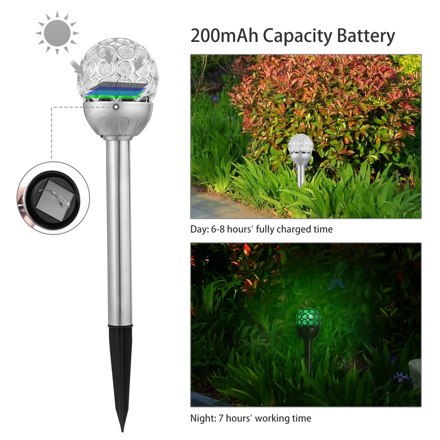 Our outdoor solar garden light adopts ABS and stainless steel materials, abrasion-resistant, anti-oxidation and durable, comes with a large solar panel which absorbs full-direct sunlight to convert into electricity effectively for glowing light at night, thus energy saving and environmental friendly. It is IP44 weatherproof and optimal for our Christmas or outdoor garden decorations.